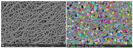 匯鴻LIBMAS可以快速獲取隔膜的孔隙率信息,檢測隔膜孔隙率、孔隙直徑及纖維直徑并統(tǒng)計分析,從而形象地描述隔膜表面的結構細節(jié),提高鋰電池隔膜孔隙率評定的準確性,如圖10、11。