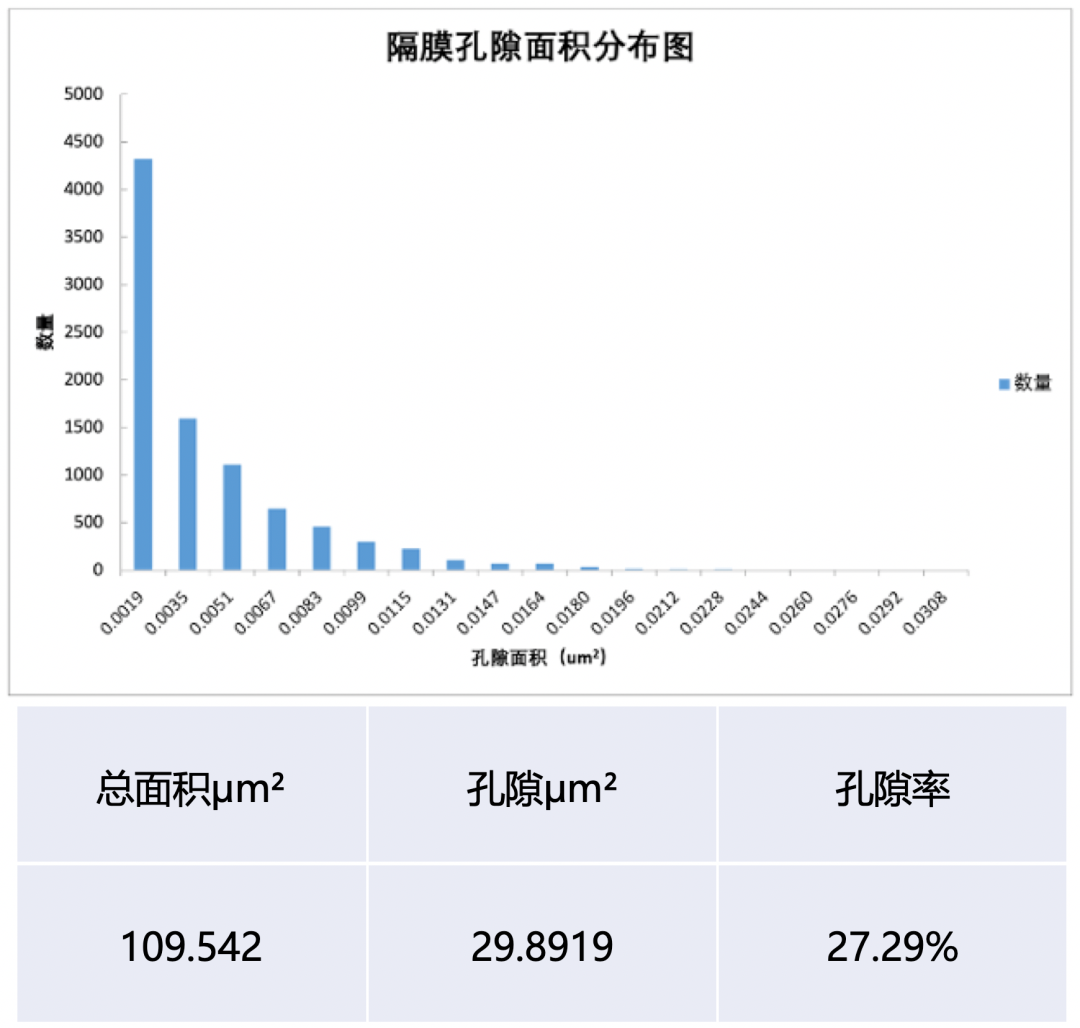 圖11:隔膜孔隙率統(tǒng)計結果及孔隙面積分布圖