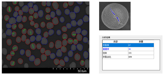 通過匯鴻LIBMAS,可快速統(tǒng)計并計算開裂球占比,獲得開裂球裂縫信息,從而改善工藝條件,如圖1。
