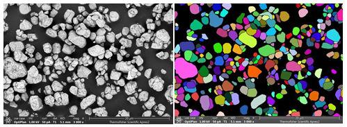 通常團聚體顆粒內部較為密實,一次粒子之間連接處存在晶界。通過匯鴻LIBMAS可高效識別一次顆粒大小(長、寬、周長、面積等)以及分布情況,如圖4、圖5。