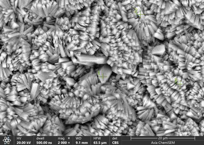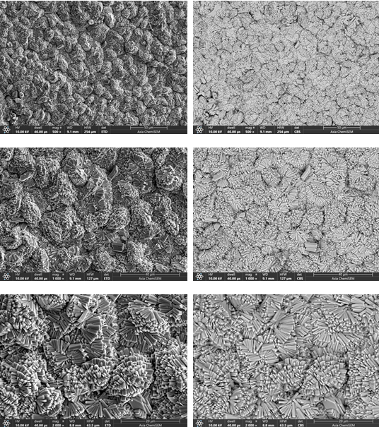 下圖為鎂合金表面的鍶磷化膜在Axia ChemiSEM鎢燈絲掃描電鏡下的SEM圖像,我們的Axia ChemiSEM掃描電鏡配備高質量的ETD和CBS兩種探測器。CBS、ETD探測器可以同時成像,既可觀察成分襯度,又能獲取形貌信息(左圖為ETD成像,右圖為CBS成像)。從掃描電鏡中我們可以清晰的看到磷化膜層均勻致密地覆蓋于鎂合金表面,有長方體形狀的晶體錯落堆疊,尺寸不一,但彼此間緊密挨連,幾乎沒有縫隙。