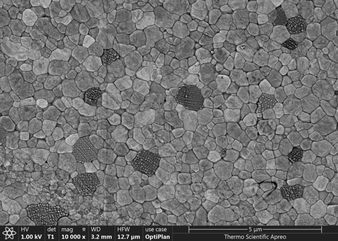 根據(jù)通道效應(yīng)的特征,其在材料領(lǐng)域具有非常廣泛的應(yīng)用。鋰離子電池三元正極材料的單個(gè)粉末顆粒是由許多不同取向的小晶粒構(gòu)成,通過(guò)氬離子研磨儀對(duì)顆粒進(jìn)行精細(xì)研磨,從而獲取平整光潔的截面。在賽默飛Apreo 2掃描電鏡的T1背散射探測(cè)器的幫助下,可以輕松獲取顆粒的通道效應(yīng)襯度像,進(jìn)而清楚觀察到各個(gè)晶粒的取向,見(jiàn)圖4。在鋼鐵行業(yè),我們需要觀察金屬內(nèi)部的晶粒取向、晶粒形狀、位錯(cuò)情況等,來(lái)改善金屬的制造工藝。見(jiàn)圖5,通過(guò)T1背散射探測(cè)器觀察到不同取向的晶粒、不同的成分襯度、不同的晶粒形狀等豐富信息。圖6展示了陶瓷材料的通道效應(yīng)襯度像,以不同的灰度來(lái)一目了然地區(qū)分不同取向的陶瓷晶粒。