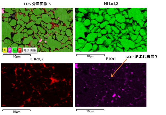 因為已經確定添加物的種類,就可以通過單一的元素來代表相應的物相,比如P代表LATP,C代表CNT、SP、粘結劑等混合相,Ni代表NCM正極顆粒。從圖2中,可以看出LATP、NCM等各種材料的分布。CNT、SP、粘結劑主要分布在正極顆粒之間,LATP也不均勻的分布在正極顆粒之間,但正極顆粒表面是否還額外的存在LATP納米包裹層,僅從EDS的Mapping圖中看,是不能被證實的(5KV激發的信號深度遠大于包裹層厚度)。因此,為了更好的辨別NCM的晶體類別和LATP包裹層的存在,需要觀察離子拋光后的截面。