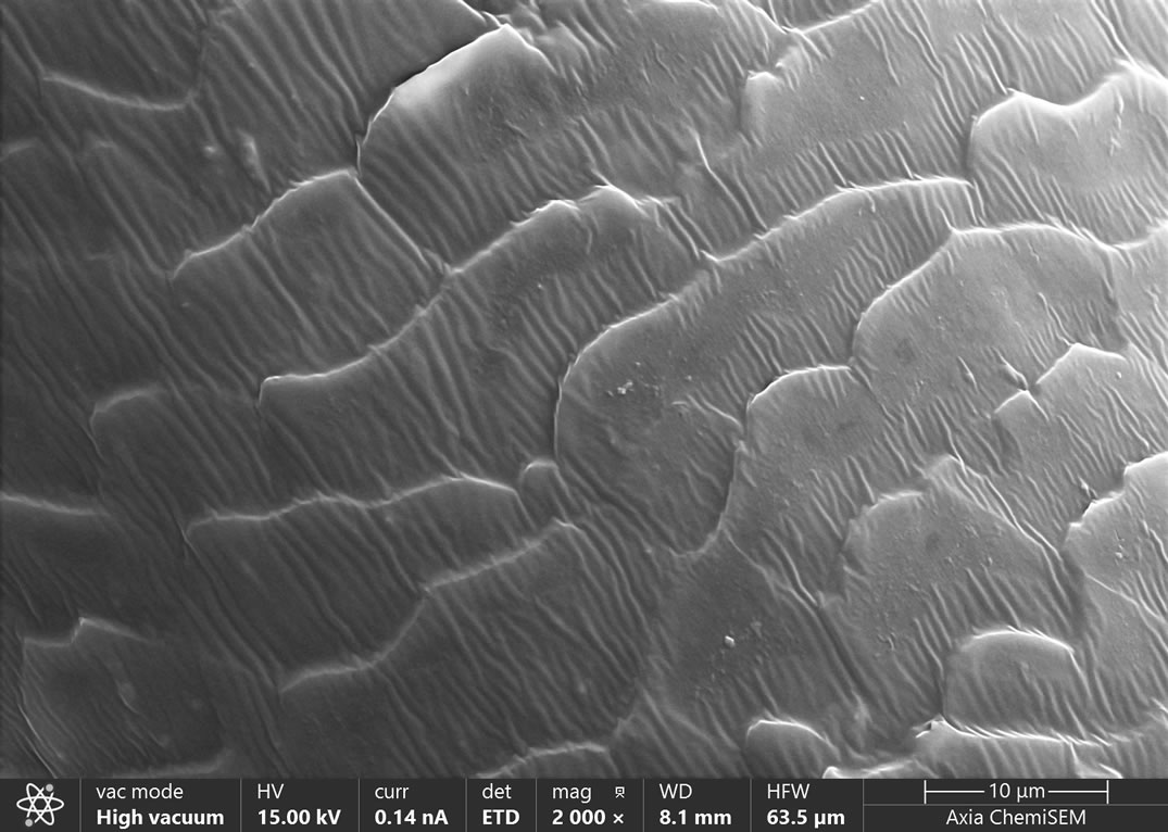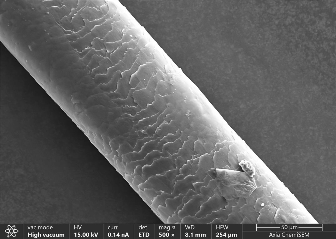 隨著時代的進步和發展,人們對美的追求已經不僅僅局限于臉部皮膚的保養,手部皮膚是否細嫩,頭發發絲是否呈現健康光澤,發量是否健康等都會影響一個人的整體氣質。頭發主要由表皮層、皮質層、髓質層等組成,表皮層主要由許多細小的鱗片重疊而成,這就是我們熟知的毛鱗片,它可以保護我們的頭發抵御外界傷害。由于人眼的分辨率有限,所以我們肉眼觀察不到微米級別的毛鱗片,借助Axia ChemiSEM落地式鎢燈絲掃描電子顯微鏡,可以幫助我們觀察頭發毛鱗片的形貌和成分,分析它的健康程度,從而協助我們有目的性地從外到內養護我們的頭發。