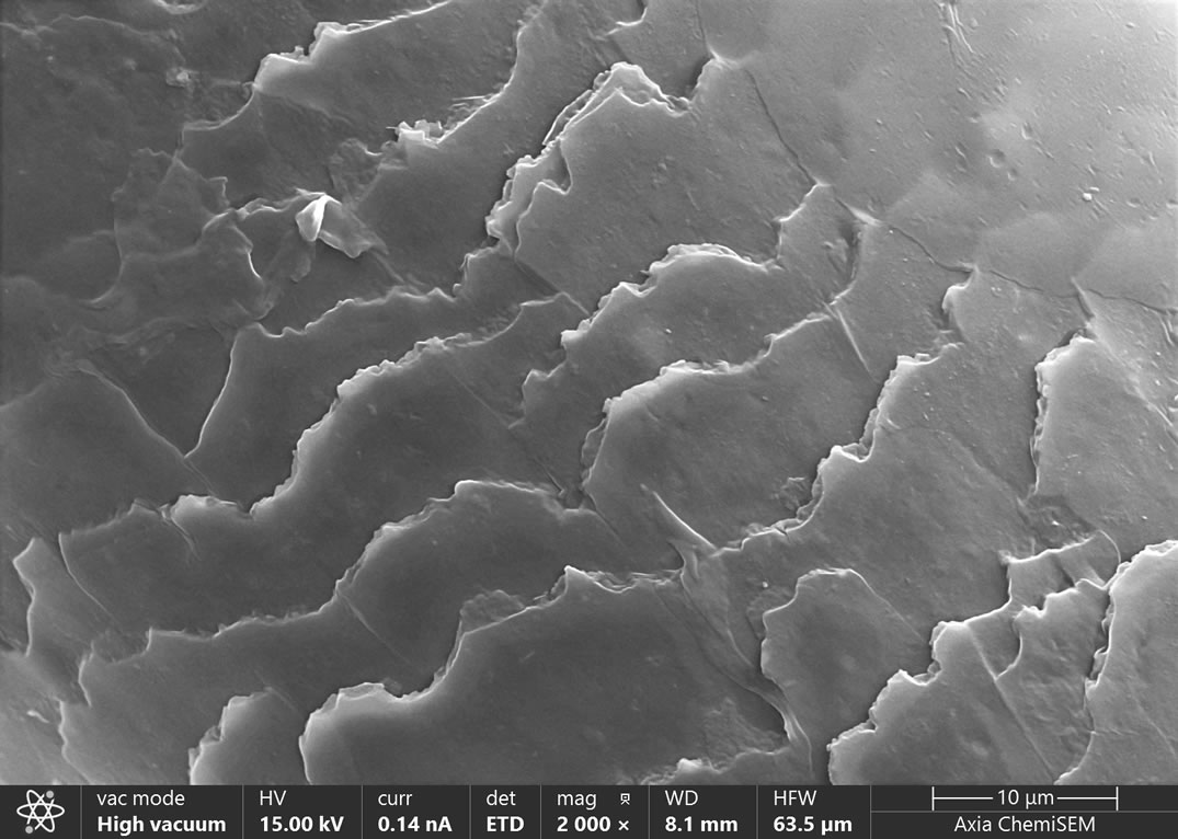 其次我們選取了使用染發劑處理過的樣本B,并對其進行了顯微分析,分析結果如下圖所示。通過Axia ChemiSEM鎢燈絲掃描電子顯微鏡獲取的圖片我們觀察到,低倍下觀察到的整根頭發的毛鱗片閉合的緊密,經過放大以后我們觀察到,發絲表面毛鱗片上覆蓋了一層類似薄膜狀的物質,呈現有規律的水波紋狀,毛鱗片更貼合毛干。發束中毛鱗片正常情況下應該是張開的狀態,在使用染發劑處理過的頭發毛鱗片整齊的閉合在一起,使得頭發卷翹的現象大幅度改善。
