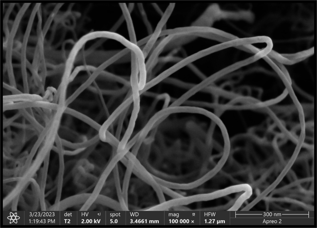 碳納米管既可以納米級一維材料,相互直接更容易搭接,形成導電網(wǎng)絡,在較低的添加量下得到性能良好的電極,用碳納米管作為導電劑,其效果明顯優(yōu)于碳黑。也可以用在LiFeO4、LiCoO2 等多種材料上面以提升電極的循環(huán)容量。同時其優(yōu)良的導電性能,可以在一定程度上克服許多正極材料電阻率高的缺點,提高電極材料整體的功率性能,可在較大電流密度下進行充放電。碳納米管的管徑非常的小,屬于納米級的微觀材料,拍攝難度較高。我們以一維的碳納米管為例,展示Apero2S在超低電壓和束流下的成像效果。