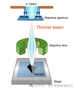因此,當(dāng)WD較小、聚光透鏡激勵(lì)較高、光闌較小時(shí),我們就能實(shí)現(xiàn)小的束斑尺寸。這三個(gè)參數(shù)是相互影響的,需要仔細(xì)權(quán)衡,才能獲得圖像,因?yàn)樗鼈冞€會(huì)影響其他參數(shù),如焦距和電子信號(hào)強(qiáng)度。