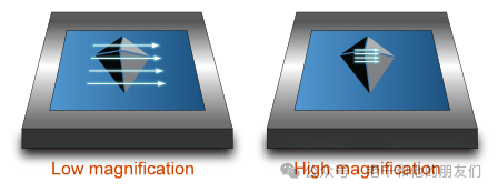 放大是指放大圖像或圖像的一部分。在SEM中,放大是通過(guò)掃描較小的區(qū)域來(lái)實(shí)現(xiàn)的。在圖像中,樣品上的電子束用箭頭表示。