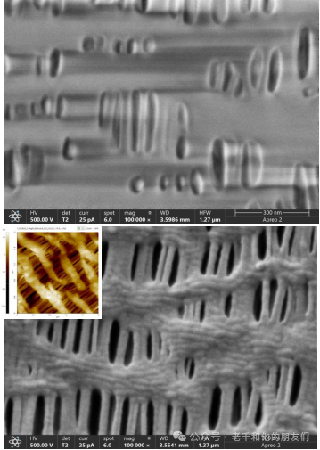圖23 鋰電池干法隔膜。上圖,不鍍膜,即使在500V低電壓下,T2探測(cè)器成像存在明顯的充電效應(yīng),隔膜形態(tài)無(wú)法辨別。下圖,鍍膜后,可以很好的緩解充電效應(yīng),用T2能拍清楚隔膜表面細(xì)節(jié)輪廓和孔隙的大小,插圖為AFM圖,可以證實(shí),濺射的過(guò)程并沒(méi)有對(duì)隔膜造成損傷,保持了較真實(shí)的結(jié)構(gòu)細(xì)節(jié)。