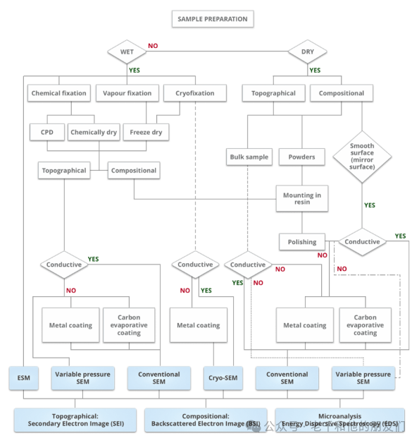 首先因?yàn)橛^察的對(duì)象不同,有生物樣品,也有材料樣品,因此,并非所有SEM都使用相同的樣品制備順序。此外,SEM的具體步驟取也決于具體的設(shè)備類型,以下是一些常規(guī)的流程和注意事項(xiàng),旨在簡(jiǎn)單闡述制備樣品的過(guò)程。