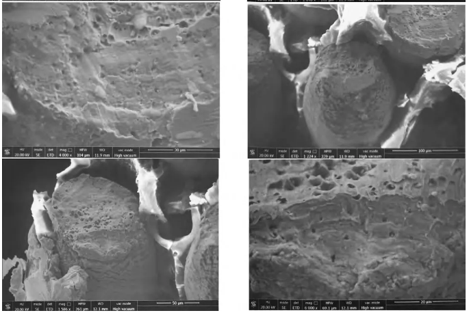 作者利用掃描電鏡高分辨、大景深和廣適應性的特點,分析出了電纜斷裂的失效原因。但在結果圖中,我們也發現含聚四氟絕緣層的顯微圖片中出現了異常亮的現象,該白色絕緣層因為導電性差的原因,表面累計了大量負電子,ZUI終積聚成荷電效應,影響整張圖片的拍攝結果。