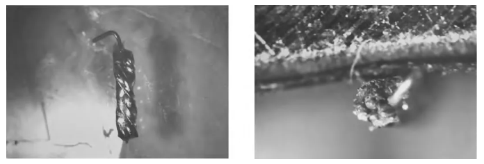 采用顯微鏡對內部進行觀察,發現內部的中心芯線與屏蔽網之間存在一層白色聚四氟絕緣層,屏蔽斷裂位置的聚四氟絕緣層已經擰成麻花狀,電纜內部形貌如下圖所示。