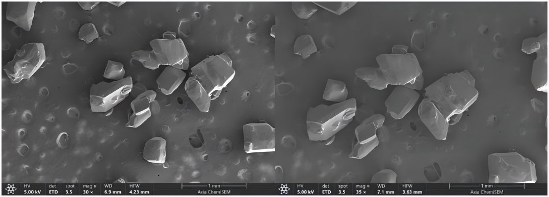 優(yōu)質(zhì)的白砂糖微觀結(jié)構(gòu)均勻細(xì)膩,顆粒大小均勻,晶體形態(tài)規(guī)整,色澤純白。這種微觀結(jié)構(gòu)能夠使砂糖在溶解、吸濕、儲(chǔ)存等方面表現(xiàn)出良好的性能。而質(zhì)量較差的白砂糖微觀結(jié)構(gòu)不均勻,顆粒不規(guī)則,可能帶有雜質(zhì),影響了砂糖的溶解、甜度和口感。因此,微觀結(jié)構(gòu)是影響白砂糖品質(zhì)的重要因素之一。如圖2所示,采用Axia ChemiSEM獲得的結(jié)果,相比于食用鹽,微觀下白砂糖顆粒棱角更加分明,表面平整光滑。