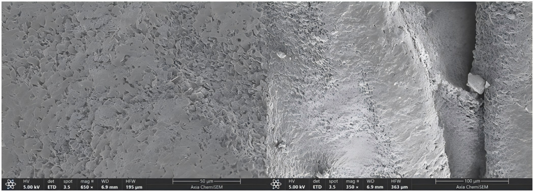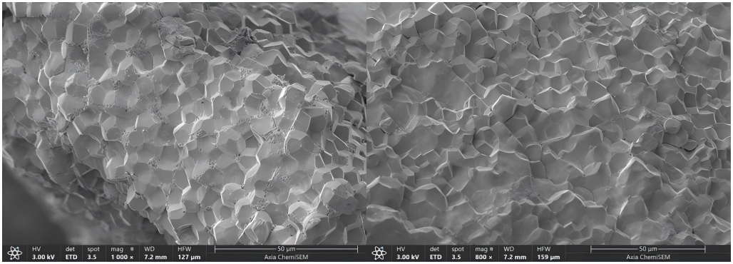 食用鹽的微觀結(jié)構(gòu)對(duì)其品質(zhì)有著重要影響。鹽的結(jié)晶形態(tài)、晶體尺寸和結(jié)晶度決定了鹽的溶解速度和溶解度,從而影響其口感和溶解效果。粗糙的結(jié)晶會(huì)使鹽的溶解速度變慢,而較小的晶體尺寸和更高的結(jié)晶度則會(huì)提高鹽的溶解性能和口感。因此,合理控制鹽的微觀結(jié)構(gòu)可以有效改善鹽的品質(zhì),使其更適合不同的食用和加工需求。如圖1所示,采用Axia ChemiSEM獲得的結(jié)果:低倍下鹽顆粒立體感十足,類似正方體,部分顆粒稍有破碎;高倍下鹽顆粒表面起伏不平,存在空隙,表面由許多小晶粒組成。