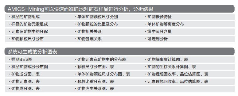 AMICS-Mining由工藝礦物學家團隊主持開發的第三代礦物參 數自動定量分析系統。該系統與高分辨率掃描電子顯微鏡結合, 廣泛適用于礦業、煤炭、地質科研等領域,是科學家及工程技術人員 對樣品進行工藝礦物學定量分析的有力幫手。